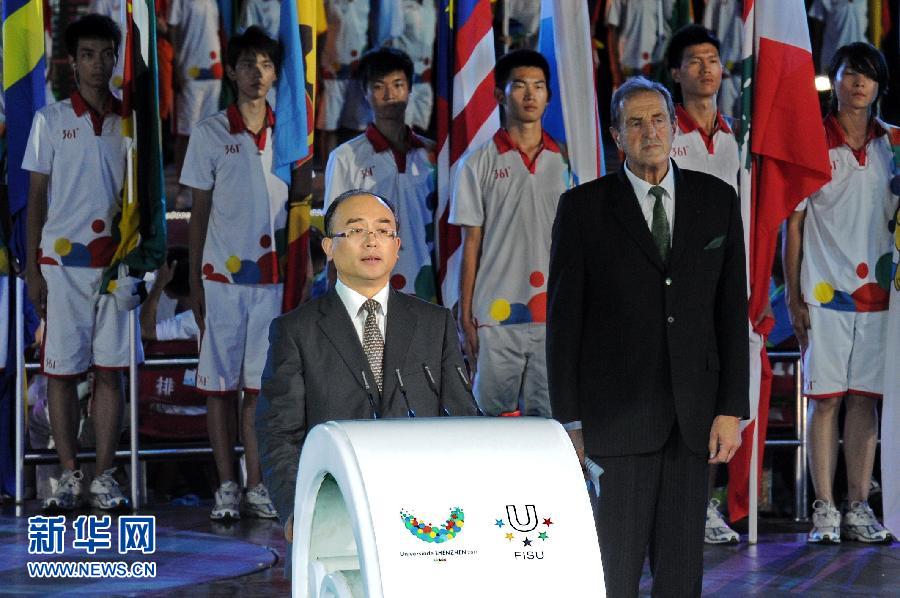 這是第26屆世界大學生夏季運動會組委會副主席、深圳市市長許勤(前)在閉幕式上致辭。新華社記者楊世堯攝