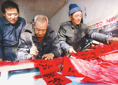 張富強(中)在寫春聯。