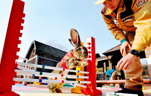 兔年春節(jié)就要到了,可愛的小兔子成了人們的新寵。韓國(guó)愛寶樂園不久前特地開辟了“兔子村”,圖為“村”里的兔子正在表演跨欄。