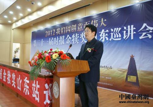 中國(guó)臺(tái)灣網(wǎng)4月25日濟(jì)南消息 日前,“第二十一屆時(shí)報(bào)金犢獎(jiǎng)山東站巡講會(huì)”在山東大學(xué)法學(xué)院禮堂舉行。旺旺集團(tuán)濟(jì)南分公司總監(jiān)李丹、金犢獎(jiǎng)組委會(huì)代表、旺旺中時(shí)傳媒總經(jīng)理助理林洛安先生、北京杰爾思行廣告有限公司執(zhí)行創(chuàng)意總監(jiān)龍杰琦先生、山東大學(xué)藝術(shù)學(xué)院副院長(zhǎng)李平教授及來(lái)自山東十余所高校的師生近五百人參加會(huì)議。與此同時(shí),“往屆金犢獎(jiǎng)優(yōu)秀獲獎(jiǎng)作品展”在山東大學(xué)藝術(shù)學(xué)院舉辦。市臺(tái)辦宣傳調(diào)研處陪同臺(tái)胞參加活動(dòng)。