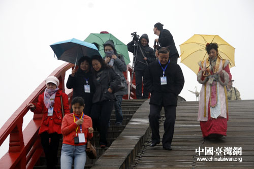 兩岸媒體參觀清明上河園,走過虹橋。(攝影 鐘寶華)