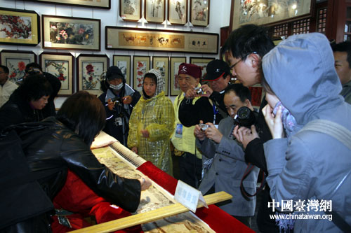 兩岸媒體在清明上河園內欣賞刺繡。(攝影 鐘寶華)