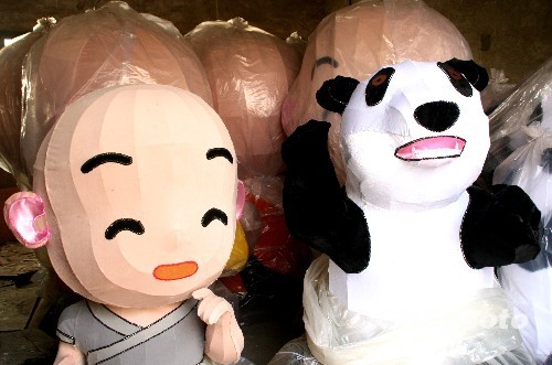 當(dāng)天裝箱啟程的花燈為二十九盞沙彌燈和三盞大熊貓燈。其中卡通版的沙彌燈造型千姿百態(tài),沙彌或立、或坐、或臥、或躺,有的攥佛珠,有的肩挑水桶,一招一式栩栩如生。尤其奪人眼球的是采用透光處理技術(shù)制作的小沙彌一米高“娃娃大頭”,凸顯俏皮活潑形象。